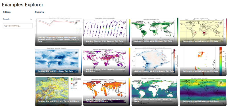 If you would like to explore a particular ECV project in more detail, try the Examples Explorer within Jupyter Lab! We have created helpful Notebooks that provide direct access to specific datasets. These are conveniently organised, ready for you to start working with.