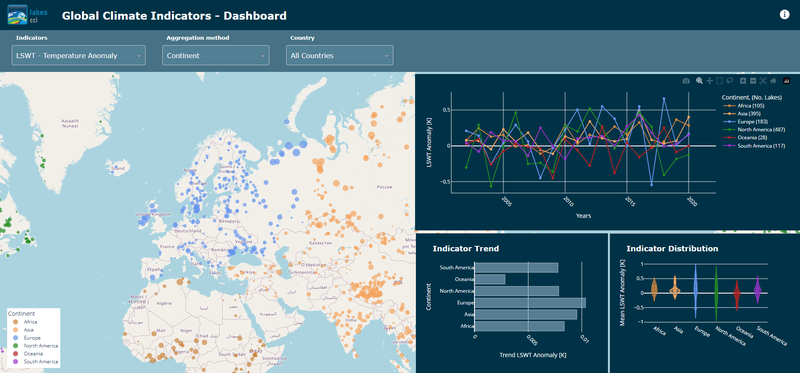 The Lakes_cci Global Climate Indicators Dashboard provides intuitive visualisation of change in lakes using a range of aggregation methods (e.g. per country, continent, by elevation, population pressure). Current indicators include the Lake Surface Water Temperature anomaly, lake heat wave occurrences and change in ice-covered area. The dashboard is hosted at https://lakescci.climate-indicators.brockmann-consult.de and will be extended with additional indicators and functionalities. Anyone interested in additional climate indicators is welcome to contact the developers at info@brockmann-consult.de